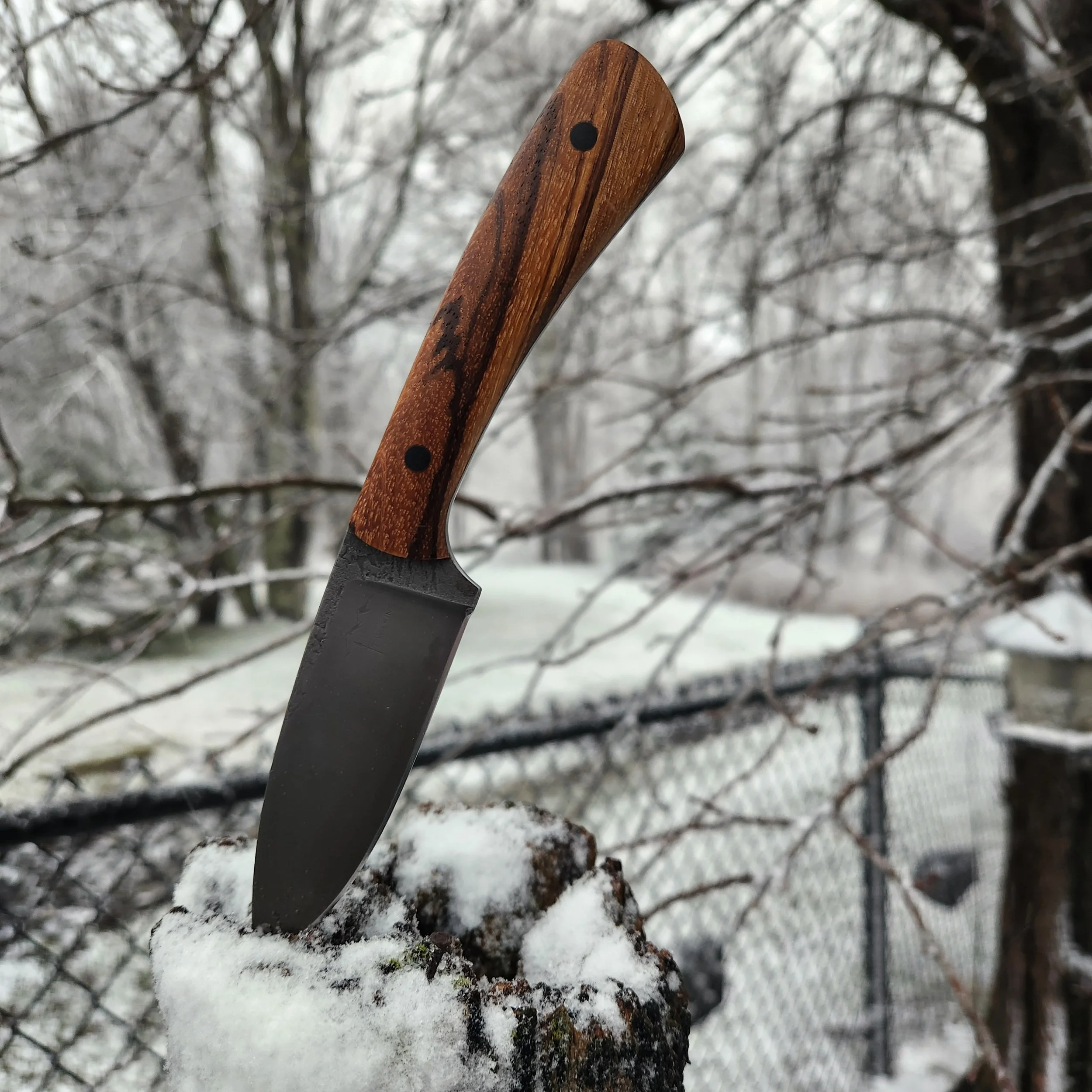 52100 high carbon steel with a patina finish. Raw zebrawood handle scales with black micarta pins. Comes with a kydex sheath.